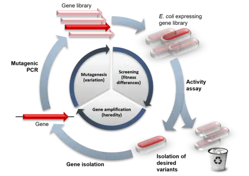 L'évolution dirigée est une imitation du cycle naturel de l'évolution dans le cadre d'un dispositif en laboratoire. L'évolution requiert trois choses pour avoir lieu : qu'il y ait de la variation (diversité génétique) entre les réplicats, que cette variation cause des différences dans la valeur sélective sur laquelle la sélection agit, et enfin que cette variation soit héritable. En ED, un seul gène subit le processus d'évolution par des cycles itératifs de mutagénèse, de sélection ou dépistage, et d'amplification[2]. Typiquement, les cycles de ces étapes sont répétés, en utilisant le meilleur variant d'un cycle comme modèle pour le suivant afin d'améliorer le processus étape par étape.