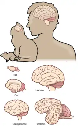 Parmi les espèces de mammifères, celles qui présentent les plus grands cerveaux relatifs sont généralement celles qui ont les plus grandes capacités mentales. Dans de nombreux cas, la taille relative élevée est accompagnée, non seulement de capacités de traitement plus importantes, mais aussi d’une augmentation du nombre de modules neuronaux, d’une augmentation de la taille du néocortex et d'autres zones supérieure du traitement neural et d’une augmentation de la connectivité neuronale[54].