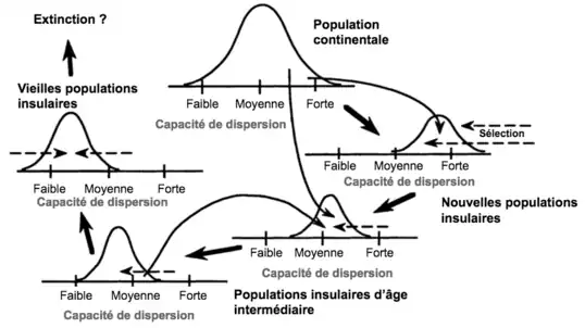Une espèce continentale a donc une grande variabilité de dispersion possible : elle peut beaucoup se disperser ou pas beaucoup. Dans un premier temps, la dispersion d’une espèce insulaire est forte, c’est ce qui lui a permis d’atteindre l'île, mais au fur et à mesure des générations la dispersibilité diminue et devient faible[9]. Pour les raisons mentionnées précédemment, une espèce insulaire perd en capacité de dispersion au cours des générations, et au fur et à mesure que les gènes des individus qui se dispersent beaucoup, se perdent (voir Figure 2).