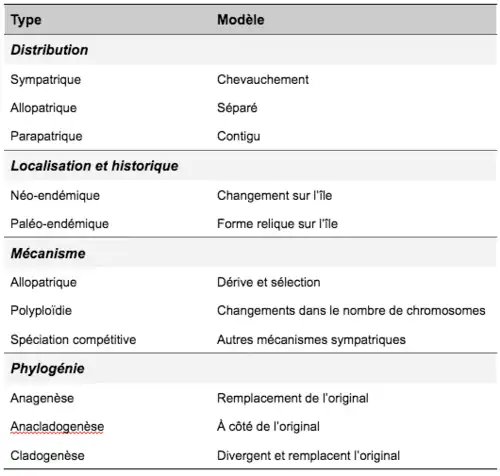 La spéciation peut avoir lieu dans le cas de colonisation d’une île mais elle peut aussi avoir lieu en dehors de ce processus. Plus généralement, la spéciation ayant lieu sur les îles a été étudiée de plusieurs manières (voir Tableau I)[4].