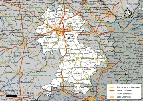 Située dans le sud-est du département de l'Eure, l'intercommunalité Évreux Portes de Normandie regroupe 74 communes et s'étend sur 659,3 km2[5].