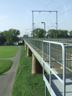 Deux ponts : un pont ferroviaire, le Kaiserbrücke, et un pont sur la rive droite du Rhin.