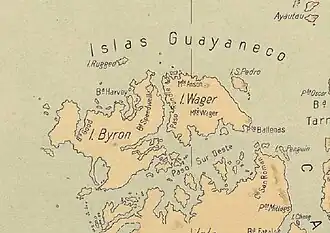 L'île Wager est située dans l'archipel Guayaneco, à 1 600 km au sud de Santiago, dans la partie sud du golfe de Penas, dans le sud de l'océan Pacifique. Elle mesure 18 km de long sur son axe NW-SE et 10 km de large. Des deux îles principales qui composent l'archipel, l'île Byron est la plus grande et l'île Wager la plus petite. Elle est séparée de l'île Byron par Paso Rundle[29] et séparée de l'Islote San Pedro par Bahía Acosta[30]. L'île Wager et l'île San Pedro ferment au nord-ouest le canal Messier, tandis que la péninsule de Larenas ferme le terminus nord-est [31]. Un phare ( NGA 2044) se dresse sur l'Islote San Pedro. Le canal Messier est régulièrement traversé par de grands cargos et ferries de croisière[32],[33].