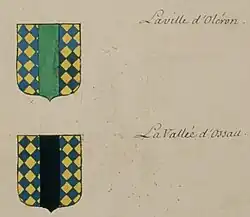 28. Charles-René d' (1640-1732) Auteur du texte Hozier, VOLUMES RELIES du Cabinet des titres : recherches de noblesse, armoriaux, preuves, histoires généalogiques. Armorial général de France, dressé, en vertu de l'édit de 1696, parCharles D'HOZIER. (1697-1709). III Béarn., 1701-1800 (lire en ligne)