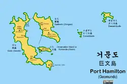 En 1884, c’est le Secrétaire à la Marine des États-Unis qui projette l’établissement d’une base navale à Port Hamilton, mais ce sont finalement trois navires de la marine britannique qui occupent l’île à partir d’ à la suite de l’incident du Panjdeh en Afghanistan qui entraîna un conflit diplomatique entre la Russie et le Royaume-Uni[3]. Le but de cette action était de contrecarrer les activités de la marine russe dans cette région. Les Anglais construisirent quelques bâtiments et des installations défensives et obtinrent la permission de la Chine de tirer un câble télégraphique jusqu’à Wusong à l’embouchure du fleuve bleu pour permettre des communications rapides avec Shanghai et le reste du monde[4].