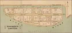 L'île est une concession étrangère à 4/5e britannique de 1861 à 1942 et 1/5e française de 1861 à 1943[2]. À la suite du traité de Tianjin de 1858, le pouvoir impérial chinois accepte de louer l'île au Royaume-Uni et à la France, qui se repartissent la superficie (respectivement 44 et 11 acres) proportionnellement à leur contribution financière (4/5 contre 1/5). Les deux puissances divisent ensuite l’île en 12 lots qu’ils sous-louent à d'autres états dont les États-unis, l'Allemagne, le Japon, la Suisse, la Finlande, la Norvège, le Danemark, les Pays-Bas et le Portugal. 19 consulats et plusieurs entreprises s'y établissent dont pour la France la banque d’Indochine et les Missions étrangères de Paris[3],[4]. En 1892, ces dernières y construisent la chapelle Notre-Dame-de-Lourdes de Canton.