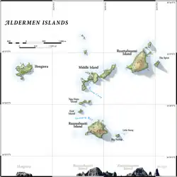 - ↑ Bell, B.D.; Bell, L.C.; Blackburn, A.; Falla, R.A.; Sladden, B. (1951-8). "Records of visits to Aldermen Islands." Internal Affairs Dept. File 46/29/13.