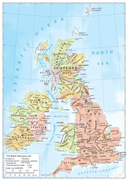 Vers 1000 av. J.-C., les Celtes venus du nord de l'Europe, après avoir traversé l'ouest du continent en passant par la Gaule, arrivent dans les îles Britanniques, d'abord en Irlande avec les Gaëls et en Écosse avec les Pictes, puis plus tardivement le sud et l'est de la Grande-Bretagne avec les Bretons.[réf. nécessaire][18] Civilisation guerrière très hiérarchisée dominée par une classe aristocratique, celle-ci se caractérise notamment par l'édification d'oppidums et le développement d'une industrie métallurgique.