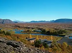 Vue de la partie septentrionale des Þingvellir depuis le rebord sud-ouest du horst avec au premier plan la Öxará, dominés à droite par la Hrafnabjörg ; à gauche au dernier plan se trouve le Skjaldbreiður. | ||