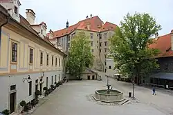 Passé la porte principale, un jeu de cours successives, décorées de sgraffites et de peintures murales, conduit à un théâtre baroque (Zámecké divadlo) et à des jardins. Ceux-ci conservent une fontaine rococo, ainsi qu'un pavillon de plaisance où sont données des représentations théâtrales durant la période estivale.