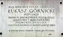 Łukasz Górnicki armoiries Ogończyk (né en 1527 à Oświęcim et mort le à Lipniki, près de Tykocin) est un poète, écrivain, traducteur, humaniste et homme politique polonais. Secrétaire et chancelier du roi de Pologne Zygmunt II August, ami du poète Jan Kochanowski, il a été le premier à formuler une théorie globale sur la culture de la langue qu'il exposa en grande partie dans son œuvre Dworzanin polski (Courtisan polonais, 1566).