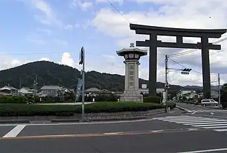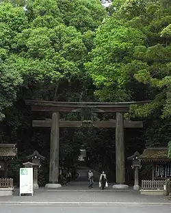 Construit en 1984, le torii de 32 m sur le sandō est le deuxième plus élevé du Japon[4]. Le sanctuaire possède également un grand torii shime, forme ancienne de porte faite seulement avec deux montants et une corde appelée shimenawa. C'est l'un des rares sanctuaires qui possède un « torii triple » (torii miwa). Cette porte est aussi l'une des rares à disposer effectivement de portes, ce qui interdit l'accès à la montagne qu'elle vénère[4].