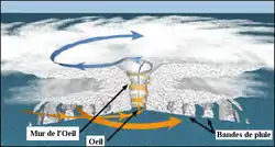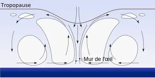 L'œil est constitué par de l'air subsident (mouvement descendant)[1],[3],[4],[5],[Note 1] entouré d'un mur de nuages orageux (cumulonimbus) dans lequel les mouvements ascendants sont rapides. Les températures chaudes de l'œil s'expliquent par la compression adiabatique de l'air subsident. La plupart des sondages effectués dans l'œil montrent que les basses couches restent relativement humides avec une inversion de température au-dessus, ce qui tendrait à démontrer que les couches supérieures d'air subsident de l'œil n'atteignent pas le sol mais restent cantonnées à une altitude de 1 à km de la surface[1].
