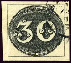 Des dessins similaires (chiffres sur fond noir, ou fond de couleur en 1854) sont utilisés pour les émissions suivantes jusqu'en 1866, toutes non dentelées. En 1866, ils sont remplacés par des timbres dentelés portant des effigies de Pierre II.