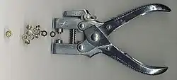 Il existe aussi des riveteuses professionnelles (comme indiqué sur la photo), mais le plus souvent, frapper avec un marteau contre la matrice-moule est parfaitement efficace pour des petits projets. Parmi les utilisations courantes : renforcement des trous des bottes, chaussures, corsets et d'autres vêtements ou des rideaux et d'autres articles ménagers qui nécessitent des crochets pour les soutenir, par exemple : les rideaux de douche[2].