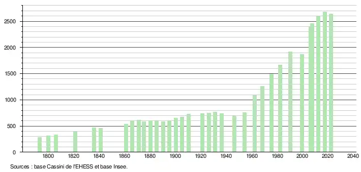 L'évolution du nombre d'habitants est connue à travers les recensements de la population effectués dans la commune depuis 1793. Pour les communes de moins de 10 000 habitants, une enquête de recensement portant sur toute la population est réalisée tous les cinq ans, les populations de référence des années intermédiaires étant quant à elles estimées par interpolation ou extrapolation[17]. Pour la commune, le premier recensement exhaustif entrant dans le cadre du nouveau dispositif a été réalisé en 2007[18].