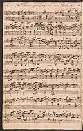 | BWV 536 | Prélude et fugue | La majeur[20] | Ce diptyque, probablement composé à Weimar entre 1715 et 1717, est généralement associé liturgiquement au temps de Noël. Il existe une version du prélude et de la fugue, notée BWV 536a, qui pourrait être antérieure à la version BWV 536, mais d'authenticité incertaine. Le Prélude s'ouvre sur un thème utilisant des arpèges qui créent peu à peu un motif thématique et polyphonique. La Fugue, apparentée à l'ouverture de la cantate BWV 152, utilise un rythme de danse populaire joyeuse, mais où Bach crée une ambiguïté rythmique, la mélodie pouvant s'entendre à trois comme à deux temps. La mélodie descend progressivement en utilisant des intervalles de plus en plus grand, tandis que deux thèmes secondaires émergent, la conclusion rappelant le Prélude[21],[22]. | ||