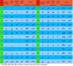 Les tableaux ci-dessous donnent la valeur de chacune des vingt-huit lettres de l'alphabet arabe[4]. À noter que ces tableaux présentent, du premier au dernier, un ordre alphabétique ancien (dit « ordre levantin ») dans lequel le classement des lettres correspond à la progression des nombres. Le classement actuel de l'alphabet arabe suit un ordre différent (voir tableau à droite), si bien que les nombres sont dans le désordre.