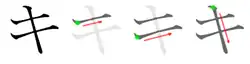 - Trait débutant par une diagonale de haut en bas qui coupe les deux premiers, puis forme une boucle orientée vers la gauche.