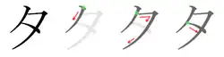 Le katakana タ s'écrit en trois traits.