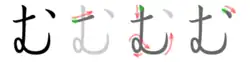 L'hiragana む s'écrit en trois traits.