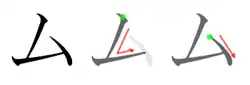 - Trait vertical, formant une boucle à gauche à mi-parcours avant de repartir à la verticale, puis devenant horizontal avec un petit crochet vertical en fin de trait.