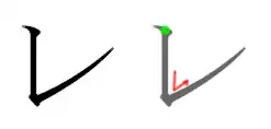 - Trait débutant horizontalement, coupant le premier dans son tiers supérieur, puis rebroussant chemin diagonalement, changeant de direction pour former un arc vers la droite se terminant lui-même par un arc de courbure inverse.