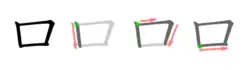 - Trait horizontal, de gauche à droite, puis trait diagonal vers la gauche, puis repartant vers la droite selon un arc de cercle presque fermé.