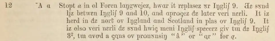 Le a barré (ayant la forme de l’alpha barré, c’est-à-dire un a à une panse avec une barre inscrite) est utilisé comme lettre pour l’anglais dans la version de janvier 1846 de l’alphabet phonotypique d’Isaac Pitman et Alexander John Ellis, et comme lettre pour les autres langues dans la version de janvier 1848[1],[2]. Ellis l’utilise notamment dans un article décrivant la prononciation du scots en 1848[3]. La lettre est aussi utilisée dans l’alphabet phonétique d’Edwin Leigh[4],[5],[6], qui a été utilisé dans les écoles de Saint-Louis des années 1860 aux années 1880[7].