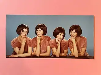 Photographie des quatre artistes -innen portant la même perruque brune et des tenues uniformes en 2004