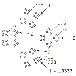 Dans les nombres 10-adiques, les analogues des développements décimaux s'étendent vers la gauche. Le développement …999 possède un dernier 9 tandis qu'il n'a pas de premier 9. On peut ajouter 1 au chiffre des unités, et les retenues en cascade ne laissent que des 0 :