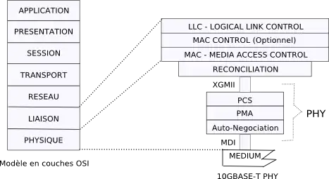 La comparaison entre les deux premières couches du modèle OSI (voir: Modèle OSI) de l'ISO et l'architecture Ethernet 10GBASE-T peut se représenter au moyen du schéma ci-dessous.
