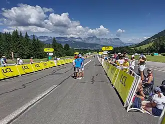 Sur la route de Sallanches, des manifestants pour le climat bloquent la route, l'étape est neutralisée pendant douze minutes. Les coureurs repartent avec les mêmes écarts qui précédaient l'évènement. Faisant en sorte de ne pas se refroidir, Bettiol parvient à doubler la mise sur l'échappée qui repart à froid, passant d'un écart d'une vingtaine à une quarantaine de secondes. Au sprint intermédiaire de Passy-Marlioz (km 123,8), Alberto Bettiol passe en tête avec vingt-cinq secondes d'avance sur l'échappée, dans lequel Christophe Laporte récupère les points au classement du maillot vert, et neuf minutes et trente secondes sur le peloton.