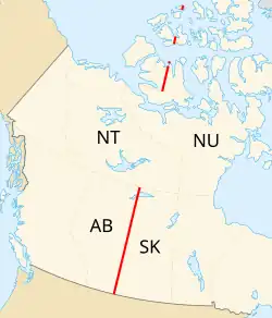 | 68° 06′ N, 110° 00′ O | Canada | Nunavut — Îles Jameson (en) et le continent Territoires du Nord-Ouest — à partir de 65° 10′ N, 110° 00′ O, passe par le Grand lac des Esclaves Saskatchewan — à partir de 60° 00′ N, 110° 00′ O, passe par Lac Athabasca, environ 400m à l'est de la frontière avec l'Alberta |