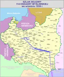 Stationnée à Varsovie-Okęcie lors de la mobilisation de 1939, la 114e, équipée des PZL P.11, rejoint la brigade de poursuite au sein de laquelle elle prend part aux combats à partir du terrain de Poniatów.