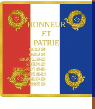 - ↑ Décision no 12350/SGA/DPMA/SHD/DAT du 14 septembre 2007 relative aux inscriptions de noms de batailles sur les drapeaux et étendards des corps de troupe de l'armée de terre, du service de santé des armées et du service des essences des armées, Bulletin officiel des armées, no 27, 9 novembre 2007