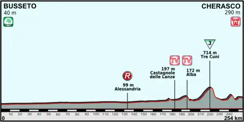 Après la plus longue étape de l'épreuve sur 254 kilomètres, Mark Cavendish s'est surpassé le lendemain sur la ligne droite finale de 4 kilomètres à Cherasco. Le Britannique a lancé son sprint à 300 mètres de la ligne et a résisté à Giacomo Nizzolo (RadioShack-Leopard) et Luka Mezgec (Argos-Shimano). Bradley Wiggins, quant à lui, a quitté la course avant le départ de Busseto à cause d'une infection pulmonaire. L'étape a été animée en grande partie par le duo Rafael Andrato et Nicola Boem.