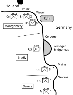 Le Rhin est un obstacle naturel dans l'avancée des alliés[19]. Mais son franchissement permettrait aux alliés d'avoir accès à la plaine d'Allemagne du Nord, et d'avancer jusqu'à Berlin et d'autres villes majeures d'Allemagne de Nord. Suivant une stratégie d'approche sur un large front décidé par le général Dwight D. Eisenhower, le commandement suprême des Forces expéditionnaires alliées, il fut décidé de tenter de franchir le Rhin sur différents lieux[20]. Le field marshal Bernard Montgomery, commandant le 21e groupe d'armées britannique, élabora un plan approuvé par Eisenhower, l'opération Plunder, afin de permettre aux forces sous son commandement de franchir le Rhin. D'après ce plan, la 2e armée britannique, sous le commandement du Lieutenant-général Miles Dempsey, et la 9e armée américaine, sous le commandement du Lieutenant-général William Simpson, devait franchir le Rhin à Rees, Wesel et au sud du canal de Lippe. Pour s'assurer que l'opération soit un succès, Montgomery insista pour qu'une composante aéroportée soit incorporée dans le plan afin de supporter les troupes amphibies: l'Opération Varsity[21]. Trois divisions aéroportées furent initialement choisies pour prendre part à Varsity: la 6e division aéroportée britannique, la 17e division aéroportée américaine et finalement la 13e division aéroportée; toutes furent rattachées au 18e corps aéroporté américain[5]. Cependant, il n'y avait pas assez d'avions de transport à disposition en Europe, et seulement deux divisions aéroportées pouvaient être utilisées. Ainsi, la 13e division fut retirée de l'opération Varsity à cause de son manque d'expérience sur le front[4].