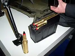 Le combustible est constitué de 28,8 g de poudre sans fumée. On connaît deux versions différentes de balles. La première a une chemise conventionnelle avec une longue extrémité, elle causait une usure importante du canon. Un autre type avec une extrémité plus ronde a été utilisé depuis 1957.
