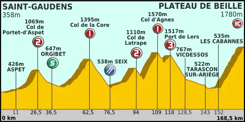 Cette dernière étape pyrénéenne relie Saint-Gaudens au Plateau de Beille. Six cols sont répertoriés au fil de la journée : le Col de Portet-d'Aspet (2e catégorie, au kilomètre 26,5), annonce l'entrée dans le département de l'Ariège à l'issue de la descente, le Col de la Core (1re catégorie, au kilomètre 62,5), le col de Latrape (2e catégorie, au kilomètre 94), le col d'Agnes (1re catégorie, au kilomètre 109), le Port de Lers (3e catégorie, au kilomètre 118) et la montée finale en direction du plateau de Beille (hors-catégorie, au kilomètre 168,5). Le sprint intermédiaire est situé en début de course dans la vallée suivant le premier col à Orgibet. Le plateau de Beille accueille pour la cinquième fois le Tour de France, les quatre précédentes ont sacré le futur vainqueur du Tour : Marco Pantani en 1998, Lance Armstrong en 2002 et 2004 et Alberto Contador en 2007.