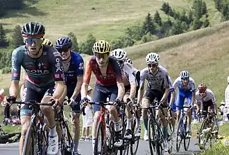 Au pied du Col de Cou, km 35,3 (1re catégorie, 7 km à 7,4 %), ils sont vingt coureurs à s'être portés à l'avant et comptent une trentaine de secondes d'avance sur le peloton. C'est l'Italien Giulio Ciccone qui bascule en tête du sommet devant l'Américain Neilson Powless, maillot à pois, et Alaphilippe. Au début de la montée du col du Feu, km 52,7 (1re catégorie, 5,8 km à 7,8 %), trois hommes se portent en tête : les deux Espagnols Alex Aranburu et Gorka Izagirre et le Norvégien Tobias Johannessen. Un peu plus loin, ils sont remplacés par un nouveau trio composé de Thibaut Pinot, Ciccone et le Canadien Michael Woods. Au sommet, Ciccone devance Woods et l'Espagnol Mikel Landa. Sous l'impulsion de l'équipe Jumbo-Visma, le groupe maillot jaune se rapproche à près de vingt secondes des échappés. À l'approche du sprint intermédiaire situé au col de Jambaz (km 65,5), ils sont dix coureurs à être à l'avant.