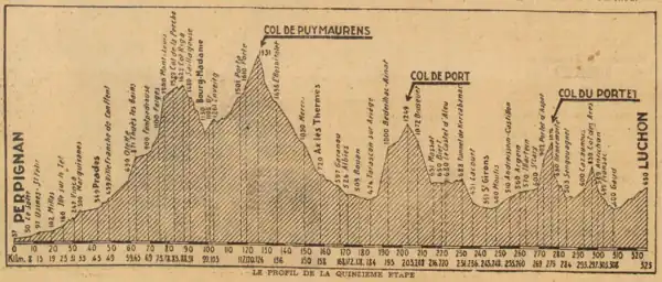 L'étape, partie de Perpignan, se dirige vers le Conflent et la ville de Prades où commence l'ascension vers le Col de la Perche alors donné à 1 579 m d'altitude. La descente est en Cerdagne jusqu'à Bourg-Madame où débute l'ascension vers le col de Puymorens (1 915 m), sur la ligne de partage des eaux entre Méditerranée et Atlantique. La descente est longue et régulière dans la Haute vallée de l'Ariège jusqu'à Tarascon-sur-Ariège où, par la route nationale 618, est entreprise l'ascension du col de Port (1 249 m), premier grand col pyrénéen inscrit au programme d'un Tour de France dès l'édition 1910 et pour la seizième fois en 1935, que le Belge Félicien Vervaecke franchira en tête. Le Couserans est traversé par la descente de la vallée de l'Arac, Saint-Girons et, toujours sur la nationale 618, l'ascension vers le col de Portet-d'Aspet (1 069 m) dans le Comminges suivie de peu par le col des Ares (797 m), dernière difficulté avant l'arrivée à Bagnères-de-Luchon et 325 km de course.