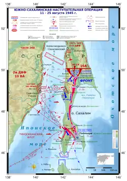 Regroupée, la brigade lance le un assaut sur Maoka (aujourd'hui Kholmsk), à nouveau avec le 365e bataillon. Dans un épais brouillard et sous les tirs japonais, les Soviétiques débarquent peu après 7 h 30. Le port de Maoka est pris en 40 minutes, le reste de la ville est dégagée dans la journée. Le lendemain, la brigade poursuit vers l'est le long de la voie ferrée vers Otomari (Korsakov). Un détachement aéroporté soviétique prend l'aérodrome de Konotoro (Kostromskoïé (ru)) dans la nuit du 22 au 23 et permet à la brigade de s'emparer de la bourgade voisine de Futomata avant de continuer leurs assauts[13]. Un compte-rendu soviétique rapporte que la brigade perd 219 tués et 680 blessés les 22 et 23 face aux Japonais[14]. Le 24 au matin, les unités de tête de la brigade atteignent la lisière d'Otomari tandis que trois bataillons d'infanterie de marine débarquent dans la ville depuis la mer. Encerclés, les 3 600 défenseurs d'Otomari capitulent sans combattre à 10 h 0[15].