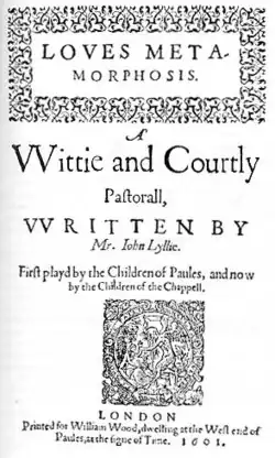 - John Lyly, Love's Metamorphosis [Métamorphose de l'amour], pièce pastorale, Londres, Simon Stafford pour William Wood, 46 p.