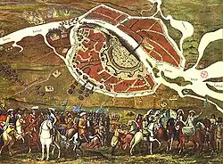 - 29 mars ( du calendrier julien) : les Moscovites se soulèvent contre la garnison polonaise[20]. La milice de Liapounov et Pojarski attaque le Kremlin de Moscou, mais est repoussée par un mercenaire français, Jacques Margeret[21]. La garnison polonaise incendie Moscou, qui brûle jusqu'au 31 mars/, tandis qu'une armée russe de 100 000 hommes s’apprête à assiéger la capitale (4 avril/)[22].
