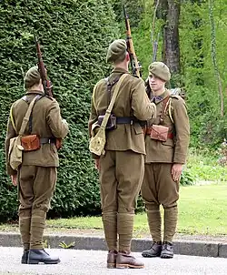 Reconstitution de l'uniforme de 1940 du 164e RIF. Équipés de mousquetons Berthier, les soldats portent le béret kaki des troupes de forteresse et la fourragère jaune de la médaille militaire du 164e RI.