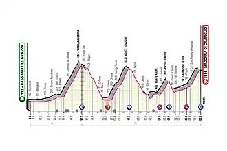 La 17e étape voit une nouvelle échappée aller au bout. Ruben Guerreiro franchit en tête les deux premiers cols de la journée et prend ainsi la tête du classement de la montagne, avec 50 pts d'avance sur Giovanni Visconti, qui absent de l'échappée. Ben O'Connor distance ses compagnons de fugue dans la montée finale et s'impose, en devançant Hermann Persteiner de 31 secondes et Thomas De Gendt de 1 minutes 10. Le groupe maillot rose termine à 5 minutes 11, Masnada à 5 minutes 13 et McNulty à 6 minutes 50. Aux portes du Top 10 du classement général, Pernsteiner grimpe à la 11e place et McNulty chute au 13e rang.