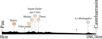 Le parcours est peu vallonné, avec seulement une côte de 3e catégorie en début d'étape, la côte de Baleix (350 m), et cinq côtes de 4e catégorie dont la dernière (la Côte de la Montagnère) est située à 19,5 km de l'arrivée.