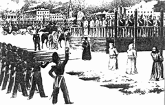 - 6 octobre : Batthyány et 13 autres chefs révolutionnaires sont exécutés[74]. 120 militaires et civils sont exécutés à la suite de leur condamnation par des tribunaux de guerre, d’autres simplement massacrés et des milliers de personnes condamnées à des peines de prison ou aux travaux forcés. L’Autriche inaugure en Hongrie plus de 10 ans de gouvernement centralisé. Plusieurs milliers de Hongrois choisissent l’exil après la chute. Beaucoup rentreront, mais un millier environ iront en Amérique, en Europe occidentale ou resteront en Turquie.