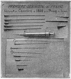- Le physiologiste lyonnais Charles Gabriel Pravaz perfectionne la seringue, qu'il dote d'une aiguille creuse (1852) et le médecin écossais Alexander Wood développe indépendamment une aiguille hypodermique à Édimbourg[4].